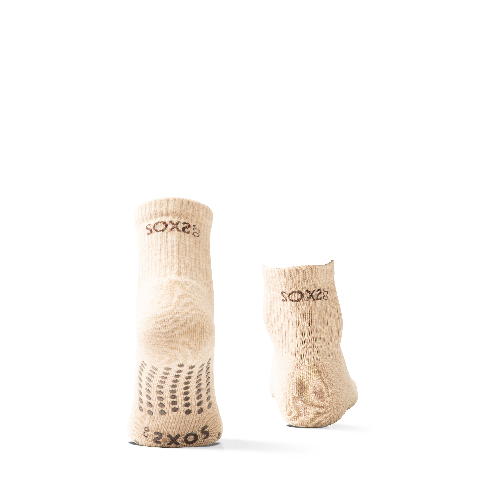 SOXS Sports Pilates Socken in Beige, einer weichen, neutralen Farbe, die zu jedem Outfit passt. Mit rutschfester Sohle und aus Bio-Baumwolle für Halt und Komfort.